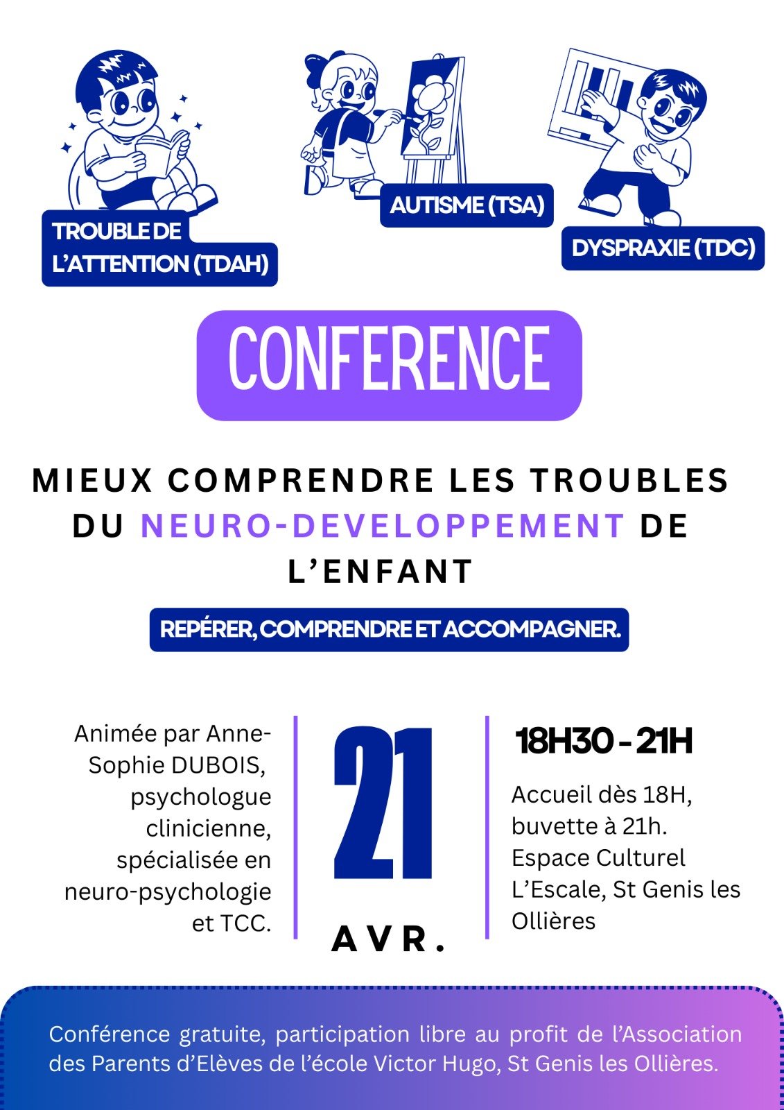 Les troubles du neurodéveloppement (TND) concernent de nombreux enfants et peuvent soulever beaucoup de questions. Comment les repérer ? Vers qui se tourner ? Quelles prises en charge existent ? Cette conférence vous apportera des réponses concrètes.